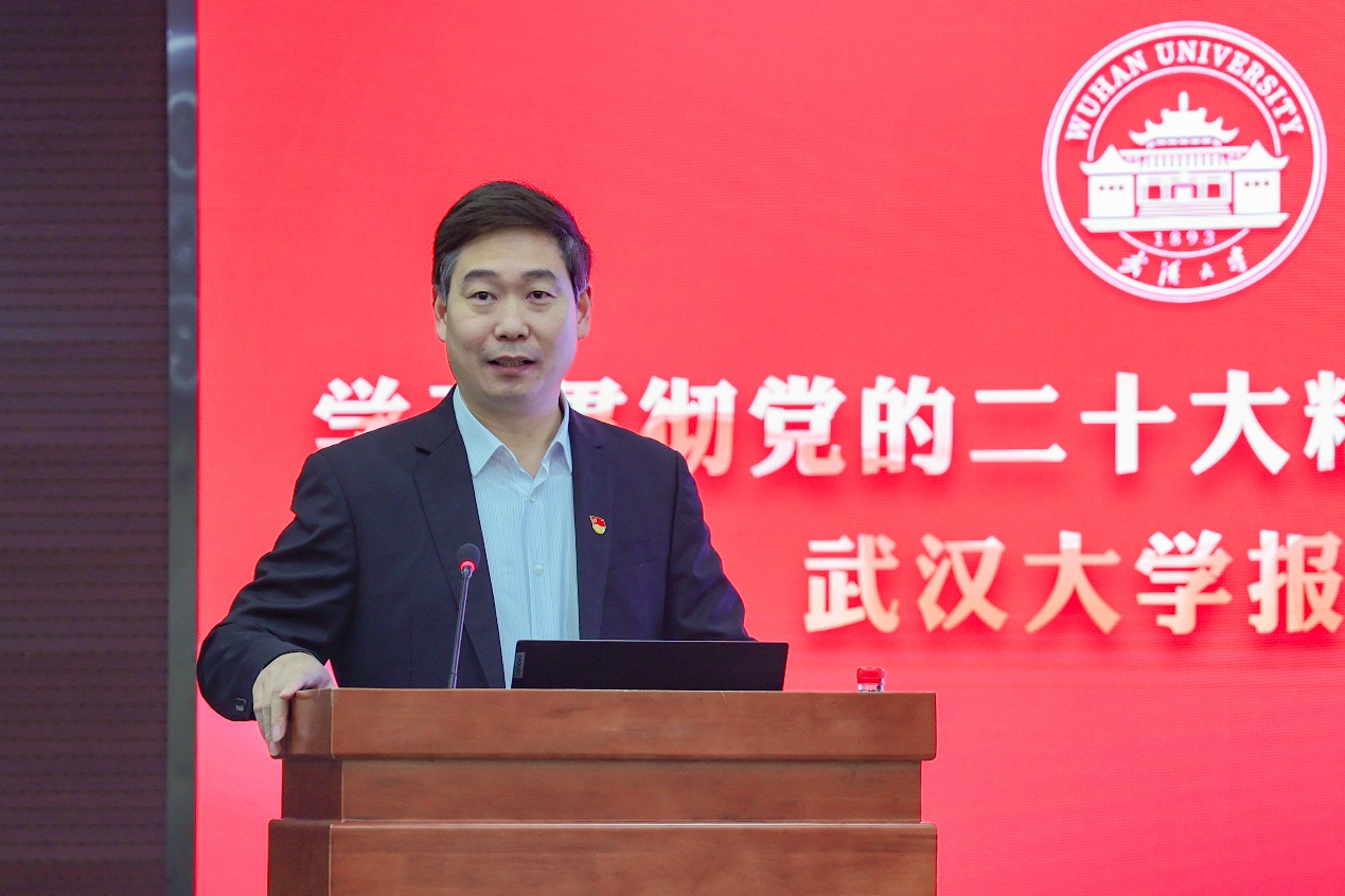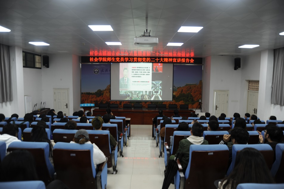 11月18日下午,校党委副书记沈壮海在学校图书馆报告厅主会场专题宣讲党的二十大精神,学院党政领导班子及教师党员代表现场聆听。