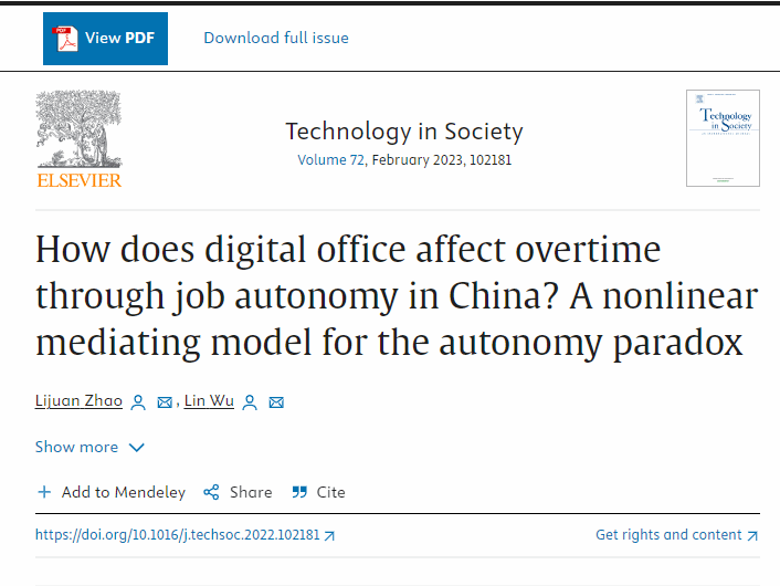 “How Does Digital Office Affect Overtime Through Job Autonomy in China? A Nonlinear Mediating Model for the Autonomy Paradox” 2023年3月发表于“technology in society”(通讯作者),万象城awc官网登录入口该研究的唯一单位,论文为订阅型免费出版。