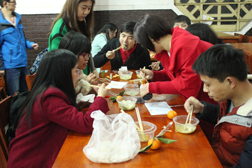 也许是因为自己亲手包的饺子,即使由于条件限制没有太多的调味品,大家仍然吃的格外香。不时地听到有同学说:“嗯,味道不错哦!”看到大家满足的样子,我们的工作组织人员内心也非常欣慰——这是我们活动的初衷!